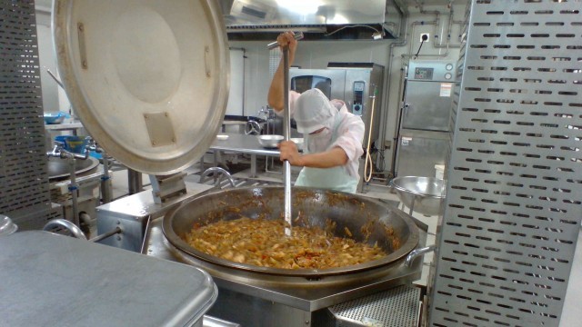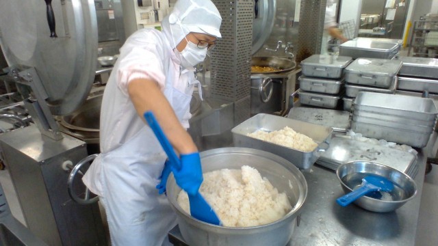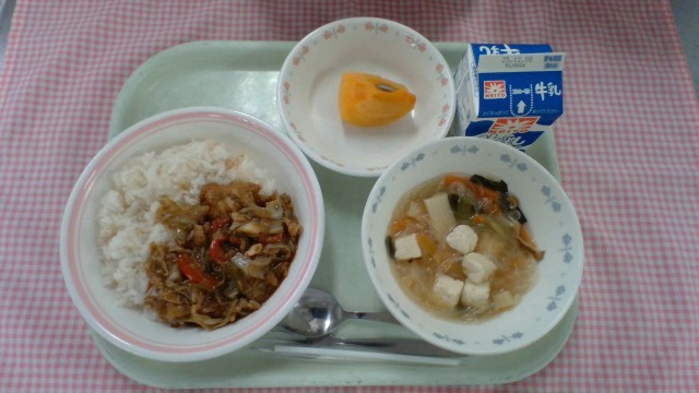 【献立】回鍋肉丼、牛乳、春雨スープ、くだもの(柿) ※写真は低学年の分量です。