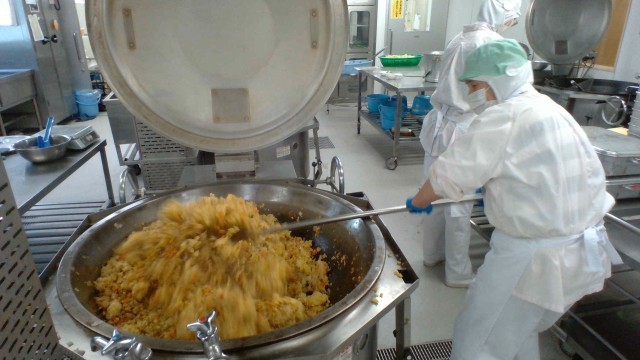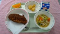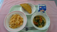 【献立】ツナカレーピラフ、牛乳、チンゲンサイのスープ、こまったさんのスペインオムレツ ※写真は低学年の分量です。