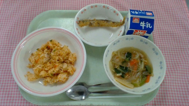 【献立】キムチチャーハン、牛乳、ワンタンスープ、ししゃものフライ ※写真は低学年の分量です。