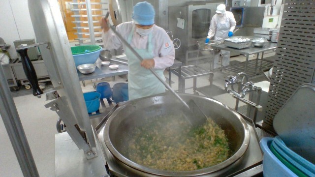 今日は東京都産の大根を使いました。12月までは葉付きの大根を届けていただけるのですが、とても立派な葉がついていました。大根の葉には、カルシウムや鉄、βカロテンなどの栄養が豊富に含まれているので、無駄なくそぼろあんかけの中に入れました。ブリの竜田揚げは、ニンニクと生姜、しょうゆなどで下味をつけてから、カリッと唐揚げにしています。教室では、給食当番が食缶を開けると「いい匂い!」「おいしいそう」と言って、楽しみにしている様子でした。