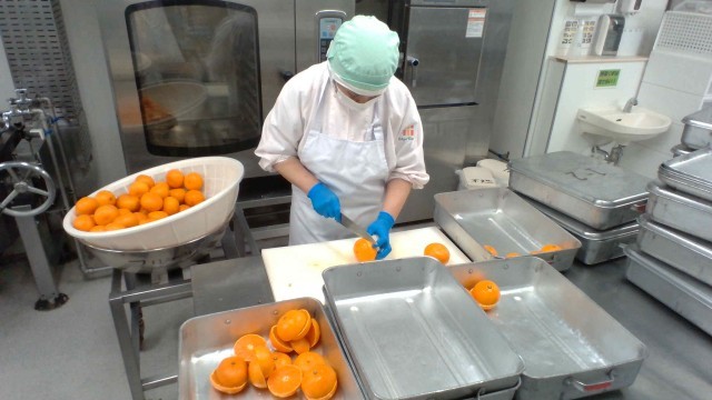 今日のくだものは「せとか」です。甘みと酸味のバランスがよく、果汁たっぷりの柑橘ですが、大きいので半分に切っています。皮が薄くてむくのが難しかったようで、低学年は苦戦する様子もありましたが、中には上手にむけた!と器のようになった皮を見せてくれました。ごはんは、油揚げを細かく切って甘辛く味付けした「こぎつねごはん」です。混ぜご飯の中ではとても人気なので、今日もよく食べていました。