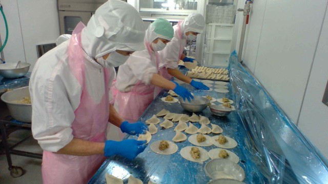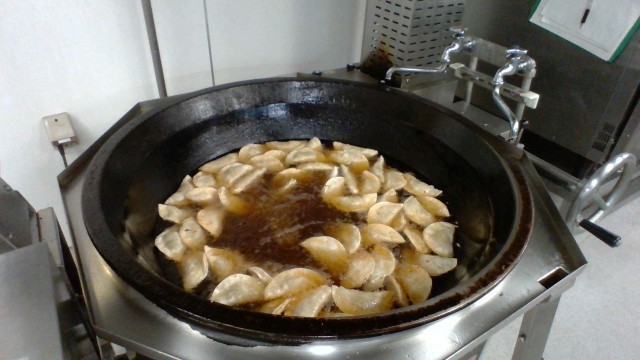 給食の揚げぎょうざは、直径14㎝から15cmもある大きなぎょうざの皮を使います。1つ1つ肉だねを包んでしっかりと閉じ、1回に50個近くを油でじっくりと揚げていきます。カリッと揚がったぎょうざは皮が香ばしく、子供たちもおいしそうに食べていました。クラスではおかわりじゃんけんで盛り上がり、見事勝った1年生は大きなぎょうざを2個も食べていました。