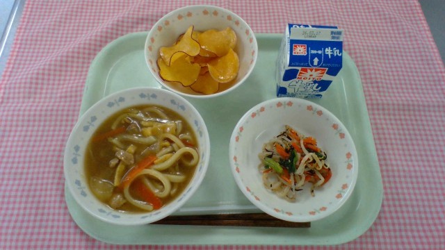 【献立】カレーうどん、牛乳、ひじきのナムル、さつまいものフラワーチップス      ※写真は低学年の分量です。