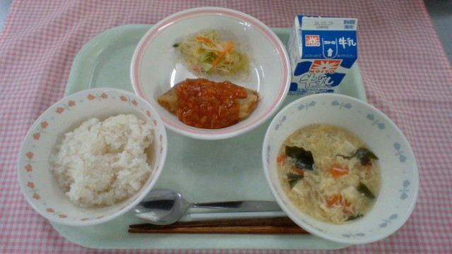 【献立】ごはん、牛乳、白身魚のチリソース、中華酢あえ、わかめと卵のスープ ※写真は低学年の分量です。