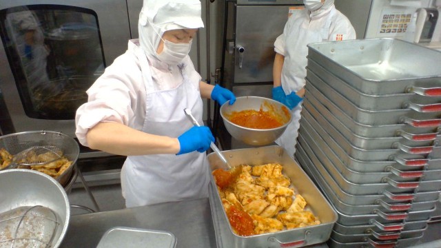 白身魚のチリソースには、トマトケチャップや砂糖、長ねぎなどで作ったチリソースがたっぷりとかかります。豆板醤はほんの少しにして辛さを控えたので1年生もしっかり食べていました。スープは鶏ガラと野菜でとり、豆腐やわかめなどの具材を入れて片栗粉でとろみをつけ、溶き卵を少しずつ流し入れてふんわりと仕上げます。人気があってよく食べてくれるスープなので、「好きなスープだ!」と嬉しそうにしている人もいました。