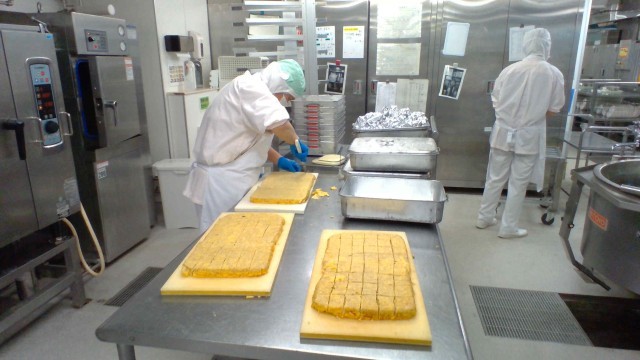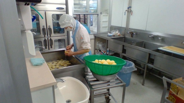 給食で使うじゃがいもは、いも専用の機械で皮をむいてから、1つ1つ芽取りをして使います。市販のじゃがいもよりも大きなサイズですが、量が多いと大変です。他の野菜も流水で3回洗ってから、料理に合わせて切っていきます。今日の卵焼きは、切干大根と豚ひき肉入りです。切干大根を入れるとふんわりした食感に仕上がります。わかめご飯と卵焼きが人気で、おかわりする人もたくさんいました。