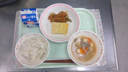 麦ご飯 牛乳 切干大根の卵焼き 揚げじゃがいもとれんこんのきんぴら 豚汁