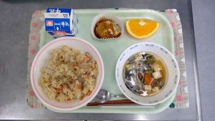 豚肉とごぼうのご飯 牛乳 豆腐のふわふわがんも いもっこ汁 ネーブル