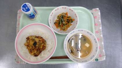明日葉のかき揚げ丼 ジョア(プレーン) 小松菜と白菜の煮浸し えのきの味噌汁