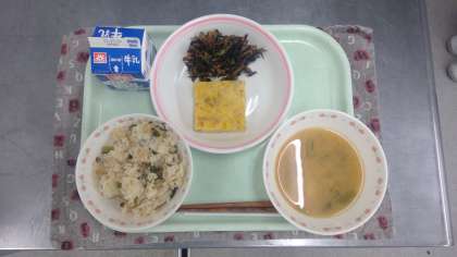高菜ご飯 牛乳 切干大根の卵焼き ひじきの煮物 じゃがいもの味噌汁