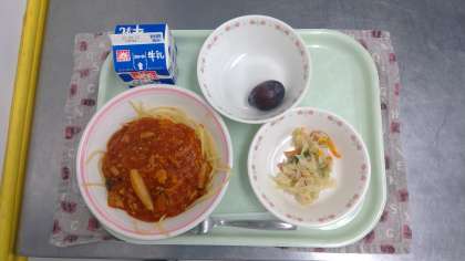 きのこのミートスパゲッティ 牛乳 ツナサラダ プルーン