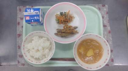 ご飯 牛乳 小魚の南蛮漬け チンゲン菜とえのきのお浸し キムチ入り味噌汁