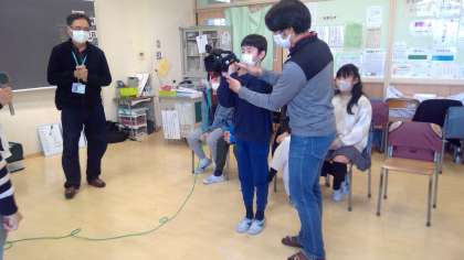 NKHよりスタッフをお招きして、出前授業が行われました。社会科の情報単元の内容について、現場を知るスタッフの方による授業が行われました。その後の体験活動では、カメラマン、インタビューをする人、インタビューを受ける人に分かれて楽しみながら活動することができました。