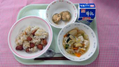 【献立】かつおくんわかめちゃんごはん、牛乳、たけのこのすまし汁、よもぎもち