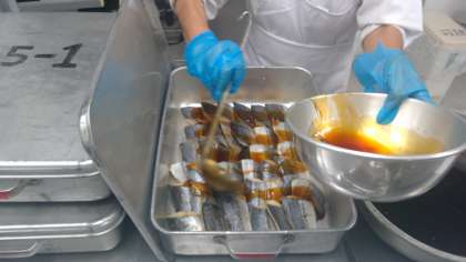 ごぼうのきんぴらは、ごぼうとにんじんを炒めて作りますが、今日はじゃがいもをカリっと素揚げにしてから、ごぼうのきんぴらに混ぜ合わせました。じゃがいもの香ばしい風味がとても美味しく仕上がります。さわらは下味に漬けてから焼き、食べやすいように上にタレをかけています。
