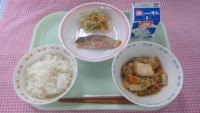 今日から1年生も給食が始まりました。食べやすくて人気のカレーライスにしました。たっぷりの玉ねぎをじっくり炒めて作ります。少し辛かったかなと思いましたが、1年生は「おいしい!」「辛くない!」と言ってモリモリと食べ、おかわりの列ができていました。あっという間に食缶は空っぽで、みんなとてもよく食べてくれていました。みかんゼリーは中にみかんの缶詰を入れてオレンジジュースで作ったゼリー液をカップに流して冷やします。