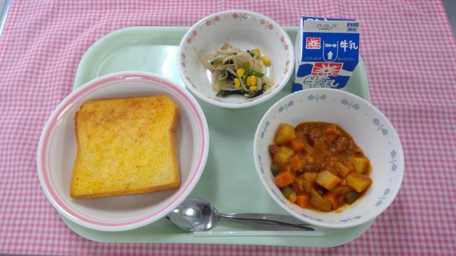 【献立】オレンジフレンチトースト、牛乳、ポークビーンズ、わかめサラダ