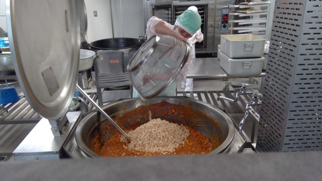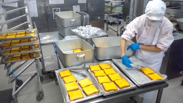 オレンジフレンチトーストは、卵、牛乳、砂糖を混ぜ合わせて作るフレンチトースト液の内、牛乳をオレンジジュースに変えて作ります。給食ではオーブンの天板に並べて焼くので、バターも溶かして混ぜ合わせています。ふんわり焼けたフレンチトーストですが、真ん中の軟らかい部分だけ最後に残して食べたり、耳にポークビーンズをつけて食べたり、色々な食べ方で楽しそうに食べていました。ポークビーンズは白いんげん豆と赤いんげん豆を軟らかくゆでてたっぷりと入れたのですが、豆が苦手な人も頑張ってくれていました。