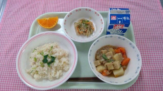 【献立】鯛めし、牛乳、新じゃがのそぼろ煮、野菜のごまあえ、くだもの(なつみ)