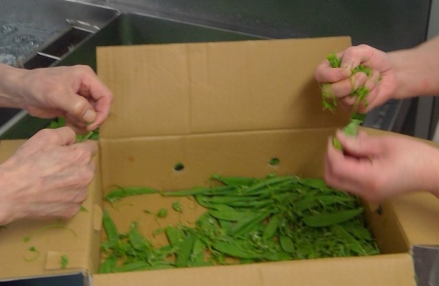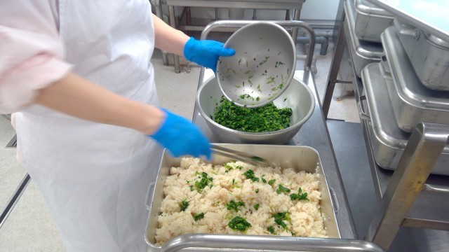 今日は1年生を迎える会にあわせ、1年生の入学をお祝いした「鯛めし」です。鯛のアラでとっただしでお米を炊き、鯛の身は塩麹で下味をつけてから香ばしく焼いてほぐし、炊きあがったごはんに混ぜ合わせました。上からゆでた三つ葉をちらしています。薄味でしたが鯛のうまみが感じられるごはんに仕上がりました。魚が苦手な人も食べてくれていましたが、三つ葉は何の葉っぱかと不思議そうでした。また、これから新じゃがいもがおいしい季節なので、今日はそぼろ煮にしました。同じく旬のさやえんどうを彩りで入れていますが、1つ1つ筋をとる作業はなかなか大変なのです。