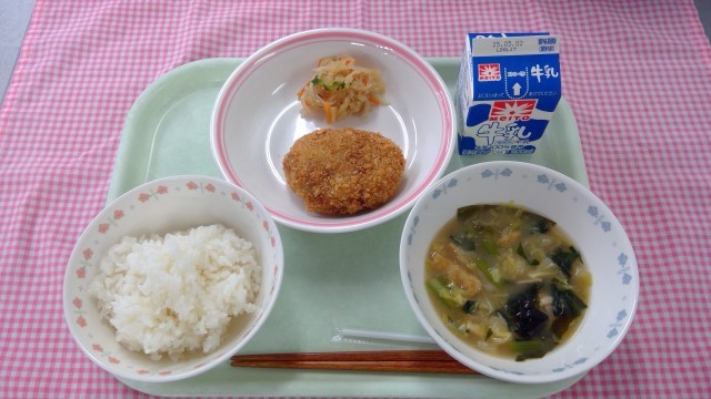 【献立】ごはん、牛乳、きんぴらコロッケ、キャベツのみそ汁、切干大根のごま酢あえ