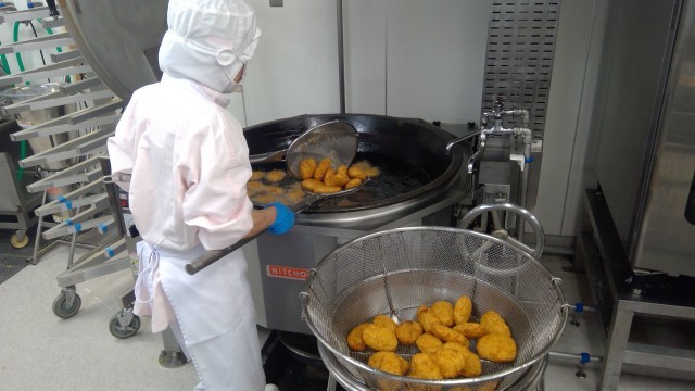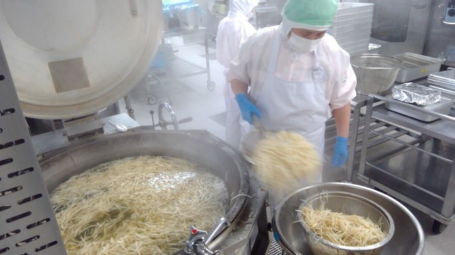 きんぴらコロッケは、豚ひき肉と玉ねぎの他に、ごぼうとにんじんも入れて油で炒め、砂糖としょうゆで甘辛く味付けした具をじゃがいもに混ぜ合わせて作ります。今日は社会科見学で3年生が出かけていましたが、500人分のコロッケを作るためには、じゃがいもが40kgも必要となります。給食室では朝から調理師さんがじゃがいもの皮をむいて切り、蒸してつぶして、具を作り、丸めて揚げて…と大忙しでした。こんがりきつね色に揚がったコロッケは、子供たちにも人気で、おかわりじゃんけんの声が響いていました。
