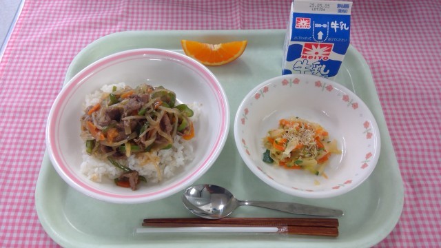 【献立】焼き肉丼、牛乳、カリカリじゃこサラダ、くだもの(セミノールオレンジ)
