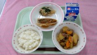 【献立】高野豆腐と卵のそぼろご飯、牛乳、早苗汁、くだもの(パイナップル)