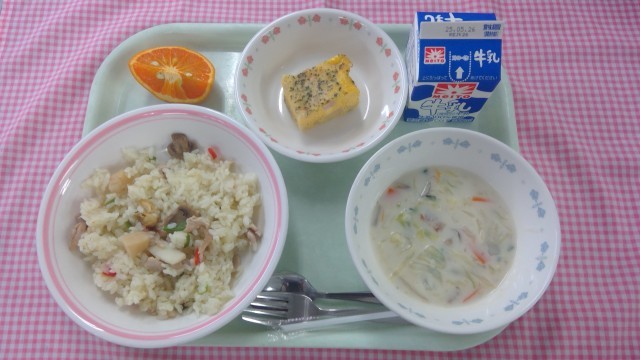 【献立】パエリア、牛乳、スペイン風オムレツ、キャベツのクリームスープ、くだもの(カラマンダリン)