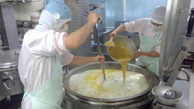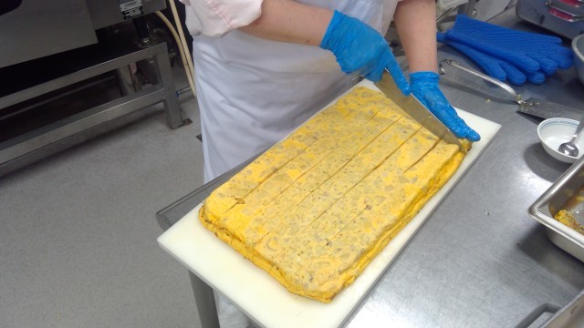 今日はスペインの料理、パエリアとオムレツを作りました。スペイン風のオムレツは、たっぷりのじゃがいもを入れるのが特徴です。スパニッシュオムレツやトルティージャともいいます。今日はじゃがいもの他に、たまねぎとベーコン、トマトも炒めて卵に混ぜ、天板に流してからオーブンでじっくりと焼き、1人分に切り分けました。ホクホクとしたじゃがいもの食感とベーコンの風味がきいていて、子供たちもよく食べていました。パエリアは、サフランで炊いたごはんに、鶏肉とイカやホタテ、あさりなどの魚介類をたっぷりと混ぜて作りました。クリームスープは、今がおいしい春キャベツをスープで煮込み、手作りのホワイトルウを入れてとろみをつけています。