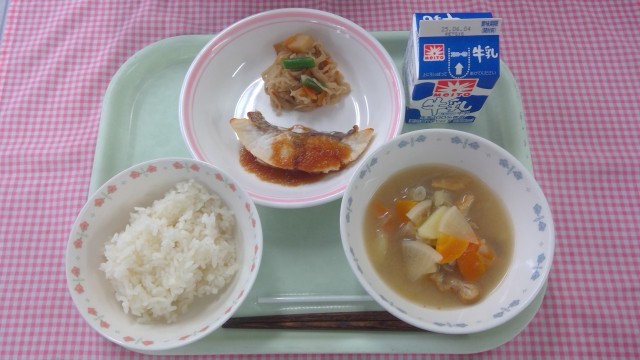 【献立】ごはん、牛乳、魚のステーキソース焼き、豚汁、切干大根の炒め煮