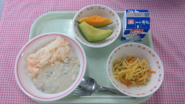 【献立】チキンクリームライス、牛乳、サウピカンサラダ、くだもの(食べ比べメロン)