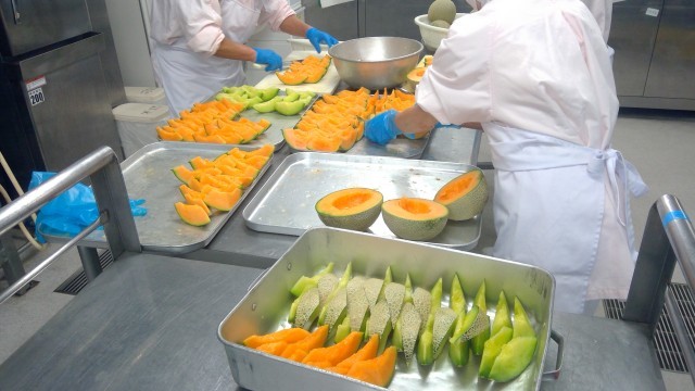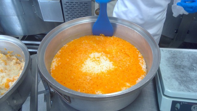 今日のくだものは、今が旬のメロンを2種類食べ比べてもらいました。1つは青肉のアンデスメロン。もう1つは赤肉のクインシーメロンです。朝から調理師さんは大量のメロンを手際よくきれいにカットして準備してくれました。子供たちもメロンが2つも食べられると喜んでいました。どちらがおいしいか尋ねると、オレンジ色!緑色!どっちも好き!と人気はほとんど同じくらいでした。チキンクリームライスは、ホワイトソースで作ったソースをかけていただきます。今回は米にバターとみじん切りにした人参を一緒に入れて炊いたキャロットバターライスにしました。