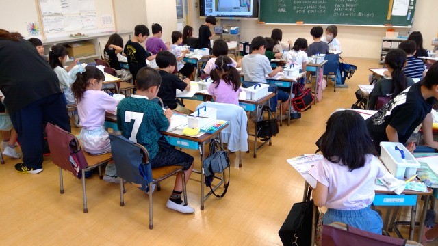 晴天の中、4年生が河津移動教室に出発しました。2日間、元気に過ごしてほしいです。2年1組図工の時間、初めて絵具を使って絵を描いています。3年1組、こちらも書写で初めての習字の学習です。