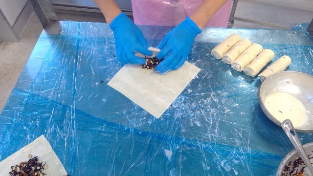 中華混ぜごはんは、豚肉やたけのこ、人参などをごま油で風味よく炒めてしょうゆと砂糖で甘辛く味付けし、しょうゆ味で炊いたごはんに混ぜ合わせました。しっかりとした味付けで、食べやすかったようです。パリパリひじきは、春巻きの皮に味付けしたひじきとチーズを包み、油でカリっと揚げています。スナック感覚で食べられる、カルシウムたっぷりの揚げ物です。