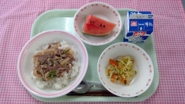 【献立】すき焼き丼、牛乳、寒天サラダ、くだもの(小玉スイカ)