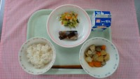 【献立】ごはん、牛乳、秋刀魚の松前煮、炒り鶏、野菜の梅肉あえ ※写真は...