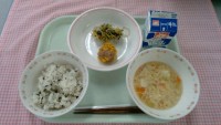 【献立】わかめごはん、牛乳、とうもろこしの菊花蒸し、かきたま汁、菊入りおひたし ...
