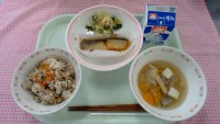 【献立】ひじきごはん、牛乳、銀ダラの西京焼き、けんちん汁、野菜のごま醤油あえ ...