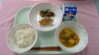 【献立】ごはん、牛乳、サバの竜田揚げ、じゃがいものカレーそぼろ煮、磯あえ ...