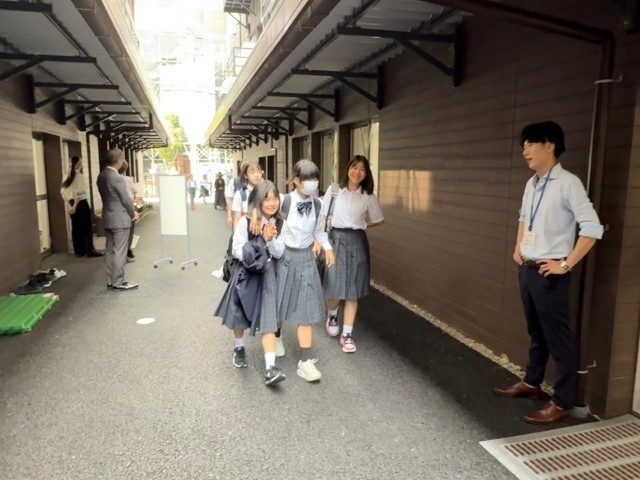 いよいよ本日、青山キャンパスの開校です。午前8時10分頃、スクールバス通学の生徒が青山キャンパスに到着しました。