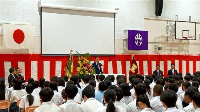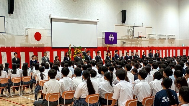 2時間目は、広尾中・松濤中の全生徒が中体育館に集まり、長谷部健渋谷区長をはじめ多くの御来賓が見守る中、開校式を実施しました。開校式の中では改めて広尾中と松濤中の教員紹介も行われました。