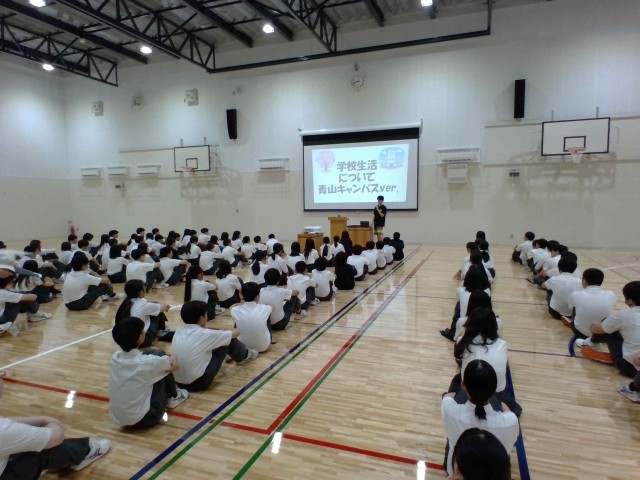 本日は、青山キャンパスに移転後、初めての全校朝礼でした。時間通りに中体育館に集合することができ、生徒指導担当の先生から、改めて青山キャンパスでの過ごし方等について話を聞きました。また、朝礼後は吹奏楽部とNコン(有志合唱)の表彰を行いました。吹奏楽部は、東京都中学生吹奏楽コンクール東日本部門銅賞の成果を収めました。校舎引越しの際に吹奏楽部の練習場所を提供していただいた都立広尾高校の関係各位に御礼申し上げます。ありがとうございました。