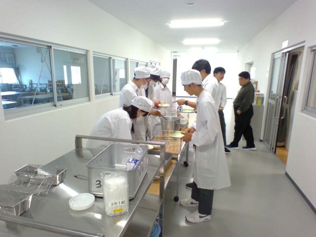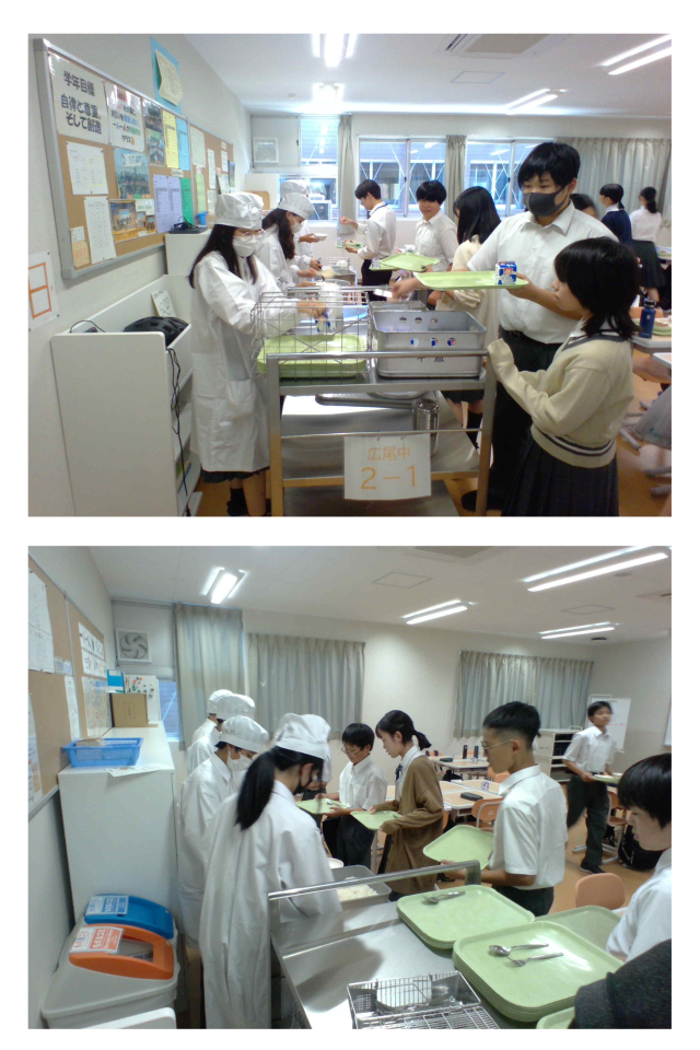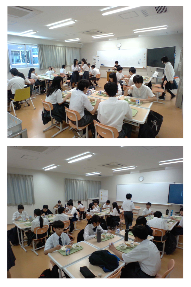 青山キャンパスでの初めての給食です。広尾中の教室配置は1フロアに全学年・全学級が並んでいます。どのクラスも素早く手洗い・準備を済ませ食べ始めていました。人数が多い3年生は廊下で配膳、1・2年生は教室内で配膳しています。