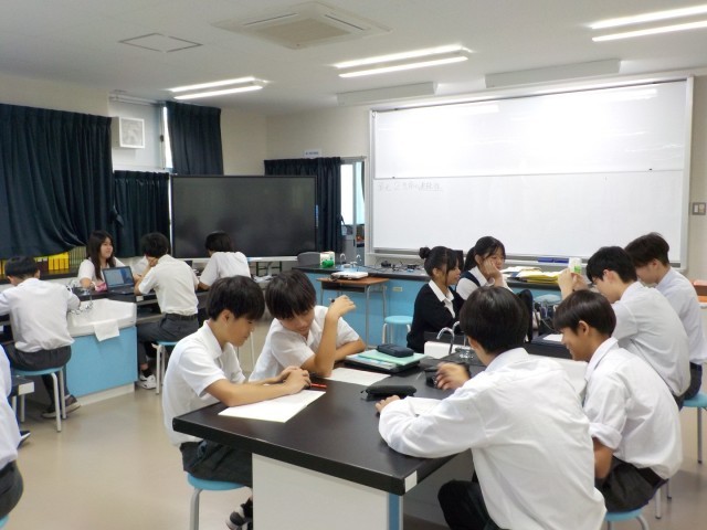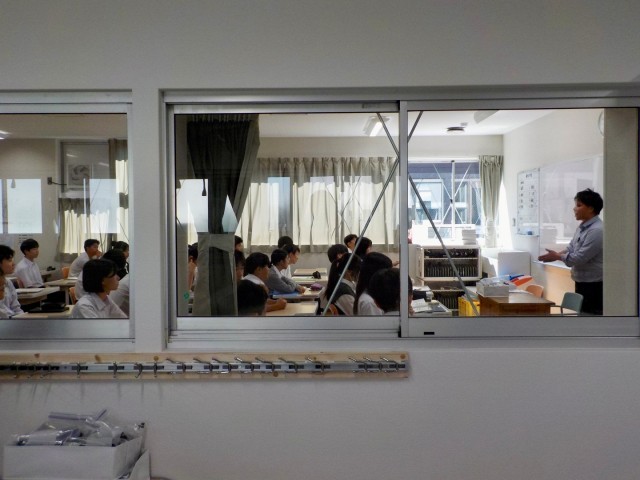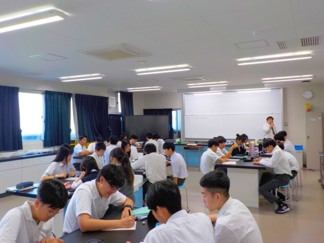 3年生の理科の授業です。本日は理科室での授業でした。写真3枚目は3年生の朝の学活の様子です。壁がガラスになっているため、教室の様子がよくわかります。