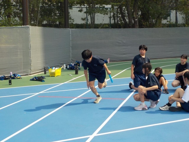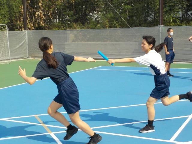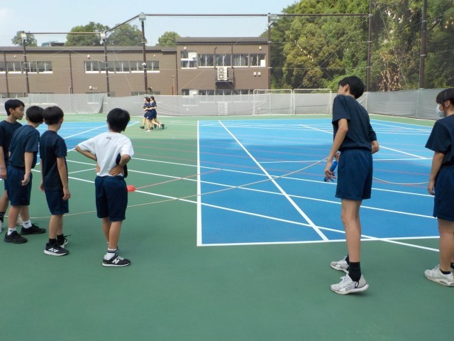 校庭では2年1組と1年1組が、リレーと大繩跳びの練習です。大繩の掛け声や縄の回し方について、2年生が1年生にアドバイスする姿も見られました。