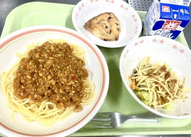 スパゲッティ―カレーミートソース ハニーポテトサラダ チョコチップスコーン