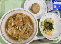 稲荷ずしの名前は五穀豊穣をつかさどる稲荷神さまの使いである狐の好物が油揚げであることから由来したという説があります。小学校では「こぎつねごはん」などと呼ばれて人気の献立です。今回はさらに具材を加えてちらし寿司風にアレンジされています。鮭のチャンチャン焼きは北海道の郷土料理になります。今日使用したバターは乳バターではなく、大豆由来の豆乳バターを使用しています。
