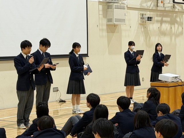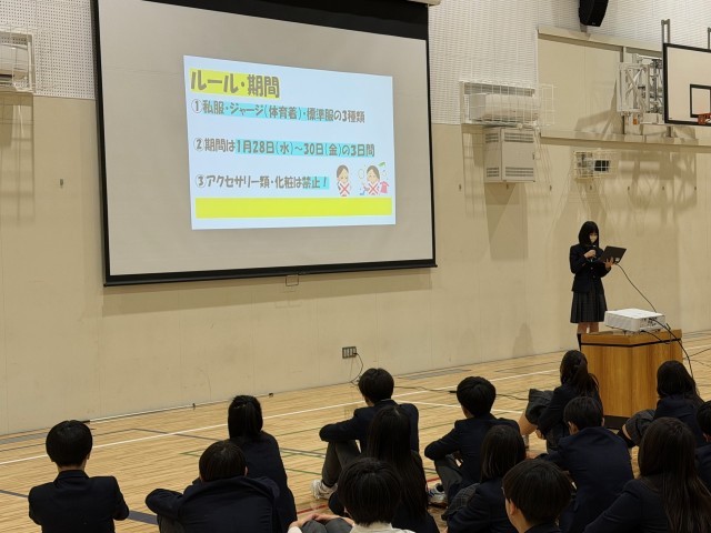 本日は生徒会朝礼からスタートです。各委員会委員長から諸連絡の後、生徒会本部役員から、冬季カジュアルDaysの告知がありました。期間は1月28日(水)から1月30日(金)までの3日間です。過去の生徒会本部役員が主体的に始めて成功させてきた生徒発案企画です。ぜひ今回も成功させましょう。生徒会朝礼の最後に1・2年生を代表して学級委員から、3年生に対して「オクトパスBOX」の贈呈がありました。1・2年生からのメッセージが入っており、置くとPASSにかかった合格祈願となっています。1・2年生の気持ちや願いが3年生に届きますように!