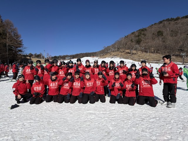 ゲレンデは宿舎から徒歩ですぐです。スキー教室の前に集合写真です。
